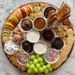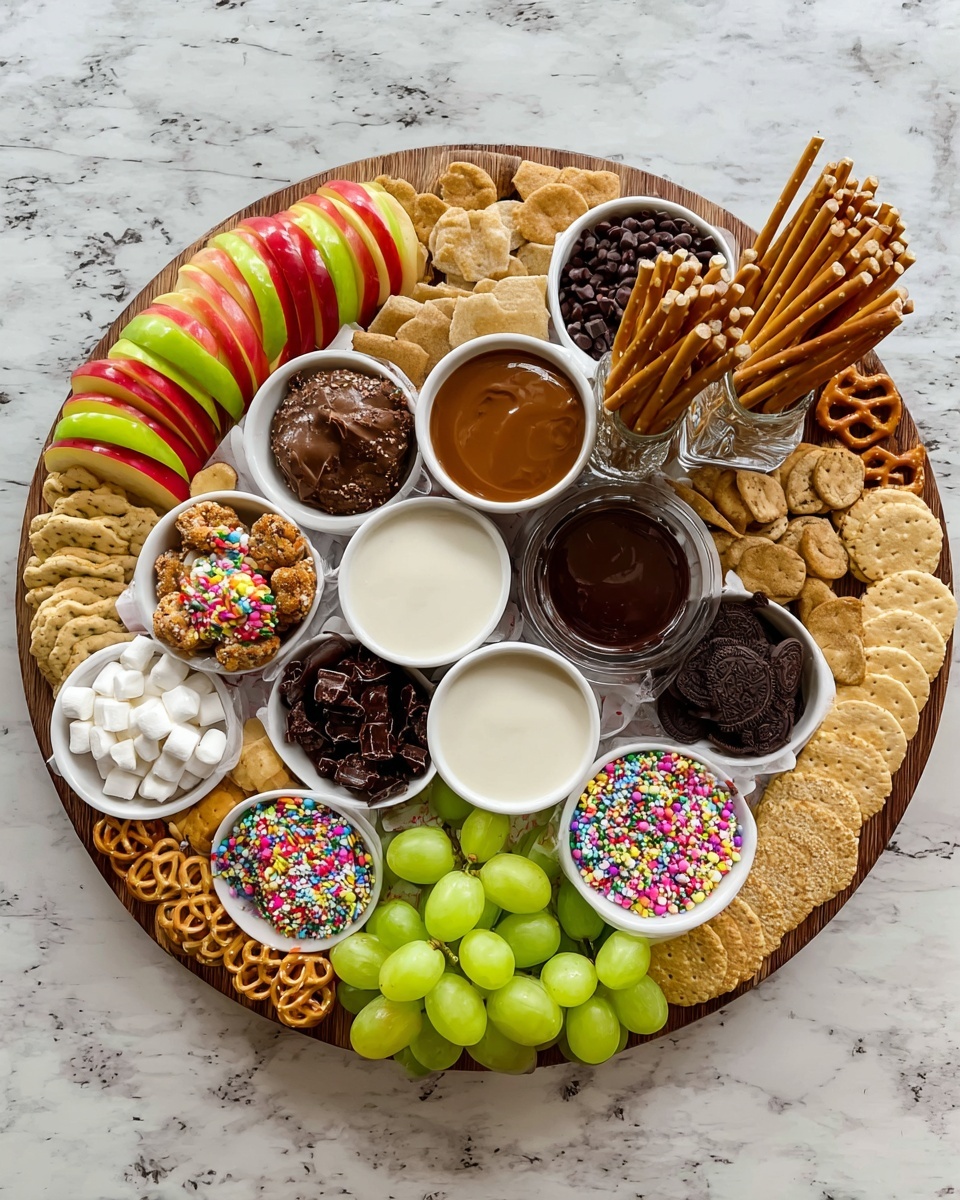 - Fill the Board: Fill any remaining spaces on the board with graham crackers, vanilla wafer cookies, and the pretzel-grape dippers to create a full and inviting presentation.
