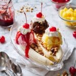 I don’t recommend freezing an already assembled banana split because the banana gets mushy and the toppings don’t fare well. However, you can freeze scoops of the ice cream and thaw the fresh fruit sauce when it’s time to serve.