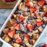 - Add Fruit Toppings: Slice strawberries and evenly distribute them along with blueberries on top of the bread mixture in the casserole dish.