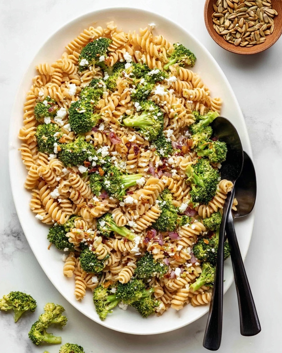 Transfer the cooled pasta into a large mixing bowl. Add the chopped broccoli, diced red onion, sunflower seeds, and crumble the feta over the top. Pour in that vibrant tomato vinaigrette and gently toss everything together until each ingredient is nicely coated. Be gentle here so the pasta doesn’t break apart and the feta stays beautifully crumbly. You can serve this salad immediately to enjoy a crisp, fresh bite or refrigerate it for a bit so the flavors deepen.