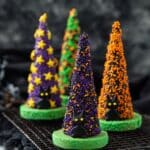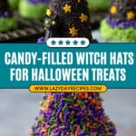These whimsical Candy-filled Witch Hats are a festive Halloween treat perfect for parties and celebrations. Made with waffle ice cream cones dipped in rich melted chocolate, decorated with sprinkles and green sour belts to resemble witch hats, and filled with an assortment of Halloween candies. Topped with a chocolate cookie base, these hats are as fun to make as they are to eat.