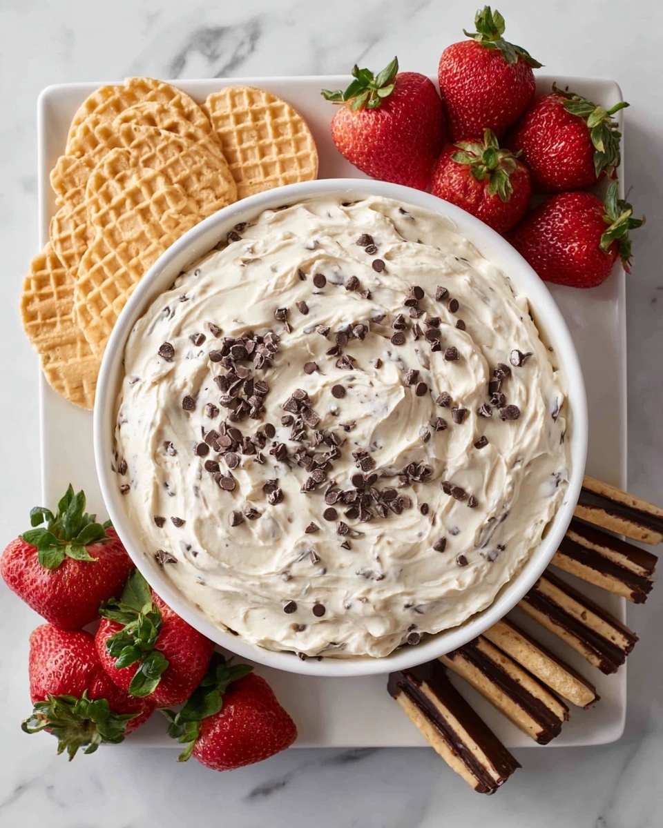 Once your dip is ready, transfer it to a pretty serving bowl. I always serve it with waffle cone cookies, buttery shortbread, fresh strawberries, or apple slices for dipping. Honestly, it’s also killer with graham crackers or simple butter cookies if you want to keep things basic. The creamy, sweet, and chocolatey combo is irresistible — I promise you’ll want to double the recipe soon enough!