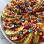 Now comes the fun part—layer on your favorite toppings: mini chocolate chips, toffee bits, crunchy salted peanuts, colorful mini M&Ms, and sprinkles. It’s like a candy buffet spread! Serve immediately, because the apples will start to soften and brown after a while, but honestly, it never lasts long in my house. Enjoy every crunchy, sweet, gooey bite.
