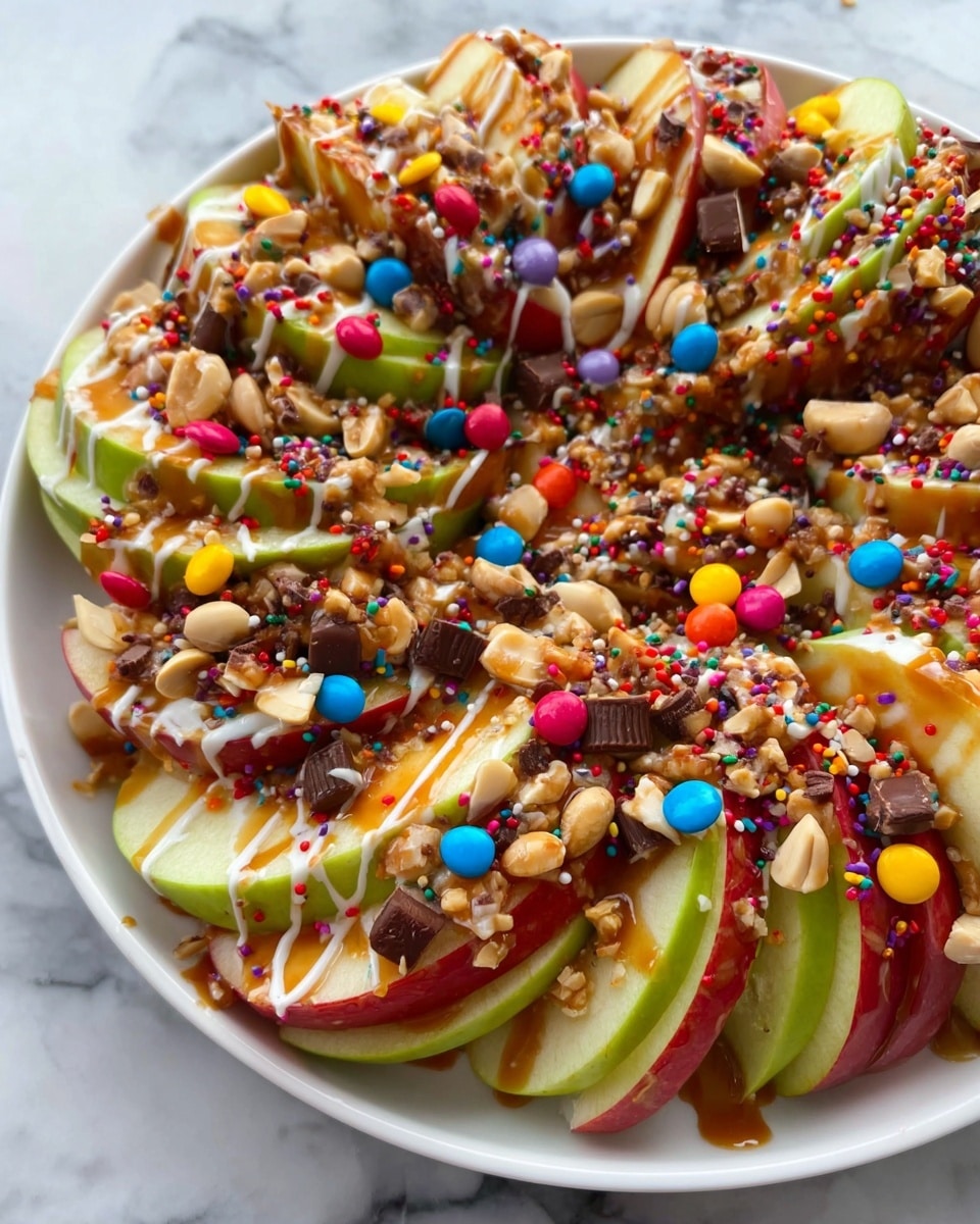 Caramel Apple Nachos is a fun and delicious deconstructed caramel apple snack featuring crisp apple slices drizzled with caramel and white chocolate, then topped with an assortment of mini chocolate chips, toffee bits, salted peanuts, mini M&Ms, and colorful sprinkles. It’s a perfect treat for fall or any time you crave a sweet, crunchy dessert that’s quick to prepare.