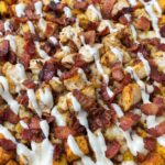 - Add Cheese and Bacon: Sprinkle the shredded mozzarella cheese evenly over the potato and chicken mixture, then scatter the cooked bacon pieces on top.