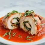 While your chicken relaxes, gently heat your tomato sauce until warmed through. Remove the butcher twine, slice the involtini into rounds, and serve them nestled on a pool of sauce. Garnish with torn basil for that fresh finish. I promise, there’s nothing like sipping sauce and biting into those melty, savory rolls!