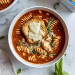 Chicken Parmesan Soup is a comforting and flavorful dish that combines tender baked chicken, aromatic herbs, fire-roasted tomatoes, and pasta in a rich chicken broth. Topped with crispy mozzarella croutons, freshly grated parmesan, and basil, this soup offers all the savory joy of classic chicken parmesan in a warm, hearty bowl perfect for any season.
