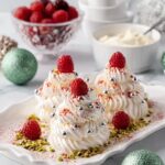 Mini Pavlova Christmas Trees are a festive and elegant dessert perfect for holiday celebrations. These delicate meringue trees are baked to crisp perfection, decorated with whipped cream, pistachio crumbs, silver cachous, and fresh raspberries, making them a visually stunning and delicious treat that serves eight.