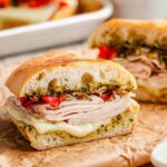 This Copycat Starbucks Turkey Pesto Sandwich features ciabatta rolls filled with savory deli turkey, creamy provolone cheese, zesty basil pesto, and sweet roasted red peppers. It’s perfectly grilled on a panini press until the cheese melts and the sandwich is warm and crispy, making for a delicious and satisfying meal that’s easy to prepare in just 10 minutes.