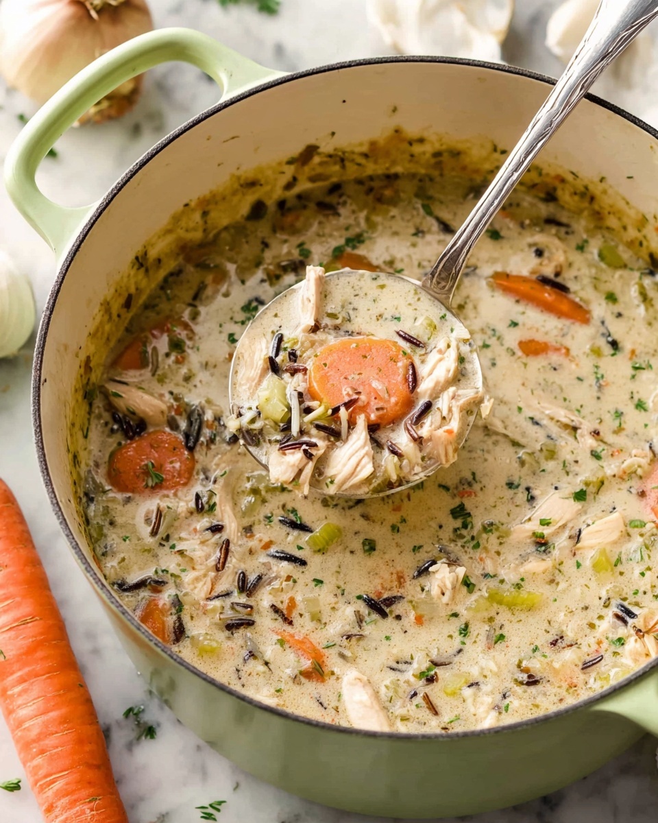 This Creamy Chicken and Rice Soup is a hearty, comforting dish packed with fresh vegetables, wild rice, and tender shredded chicken in a rich, creamy broth. Perfectly balanced with herbs and a touch of seasoning, it’s an easy-to-make recipe from scratch that delivers warmth and nourishment in every spoonful.