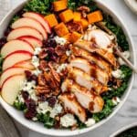 I don’t recommend freezing this salad because the texture of fresh kale and apples changes when frozen, and the dressing might separate. However, you can freeze extra cooked chicken and roasted sweet potatoes separately and toss fresh ingredients together when you’re ready.
