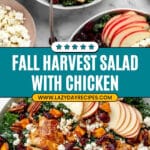 A hearty and vibrant Fall Harvest Salad featuring roasted sweet potatoes, seasoned chicken breasts, and a tangy balsamic vinaigrette. This salad combines nutrient-rich kale, fresh honeycrisp apples, creamy goat cheese, crunchy pecans, and sweet dried cranberries for a perfect autumn meal that’s both satisfying and full of seasonal flavors.