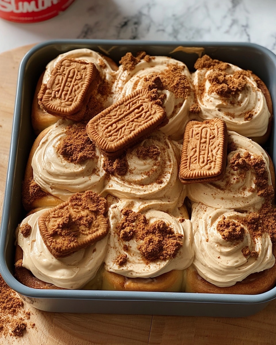 - Frost and Serve: Remove rolls from oven and let cool for 10 minutes. Spread the cookie butter cream cheese frosting generously over the warm rolls before serving.