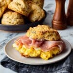 Slice the biscuits in half and spread softened butter inside. I like to pile mine with soft scrambled eggs and slices of salty prosciutto — it’s comfort food that feels elevated. My family goes crazy for these, especially when the cheese inside is all melty and warm.