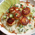 - Plate and Garnish: Serve the creamy risotto onto plates, top with the seared scallops, and garnish with lime wedges, sliced cucumber, crispy shallots, and extra fresh mint leaves for freshness and crunch.