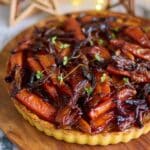 This Gluten Free Vegetable Tarte Tatin is a delicious savory tart featuring caramelized roasted vegetables, red onions, and crispy pancetta glazed with honey and balsamic vinegar, all encased in a flaky gluten free puff pastry crust. A perfect way to elevate leftover roasted vegetables and create a comforting yet elegant dish suitable for any meal.