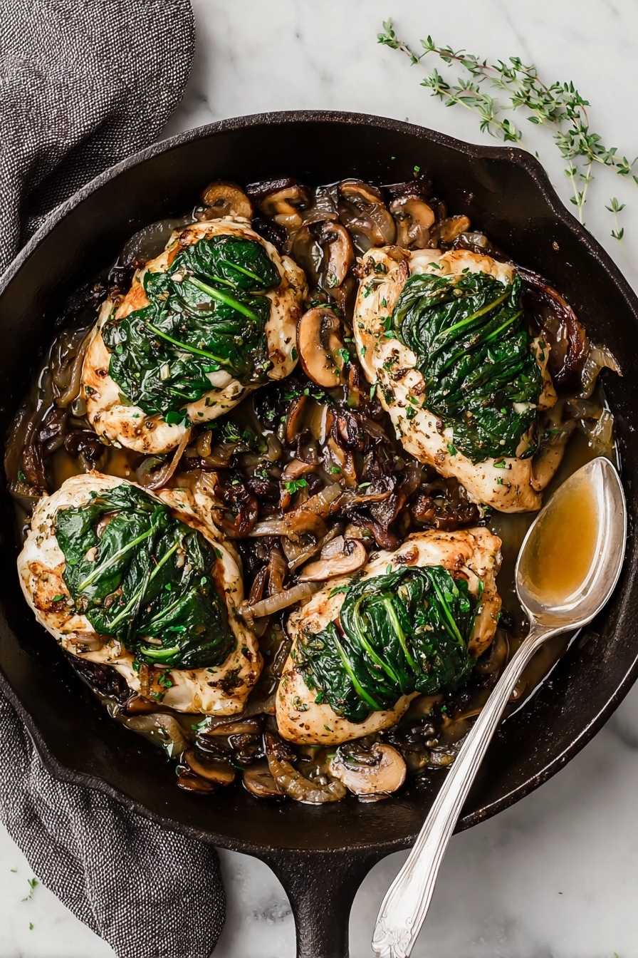 This Goat Cheese & Spinach Stuffed Chicken Breast with Caramelized Onions and Mushrooms is a flavorful and elegant dish perfect for a wholesome dinner. Tender chicken breasts are carefully hasselbacked and stuffed with a creamy spinach and tangy goat cheese mixture, then baked alongside caramelized onions and mushrooms for a rich and savory finish.