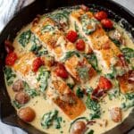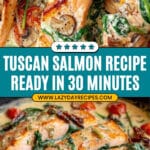 Creamy Tuscan Salmon features tender salmon filets cooked in a rich, flavorful sauce made with sun-dried tomatoes, cherry tomatoes, garlic, spinach, and Parmesan cheese. This easy skillet recipe delivers restaurant-quality Tuscan flavors in just 30 minutes, perfect for a quick weeknight dinner or a special meal.