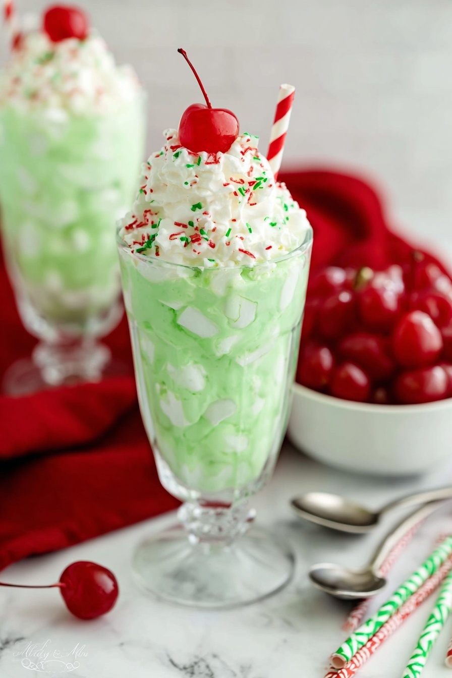 This festive Grinch Fluff is a vibrant and creamy dessert salad perfect for holiday gatherings. Combining tangy cream cheese, sweet vanilla pudding, and fluffy marshmallows with a playful green color, it’s topped with whipped cream, colorful sprinkles, and maraschino cherries for a fun and delicious treat.