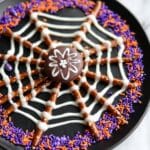 Place chocolate chips in a microwave-safe bowl and heat in 30-second bursts, stirring in between, until completely melted and smooth. Use a small baggie with a tiny hole cut in the corner to pipe your spider details. Start by drawing a plus sign (+) and then an X on top of it to form the spider’s 8 legs right in the center of each web. Then fill in a small circle for the spider’s body, and press two tiny sprinkles on top for eyes. This little spider detail really brings the whole web to life—and trust me, everyone will want to examine your handiwork closely.
