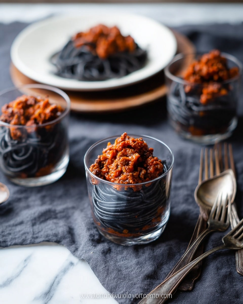 - Combine and Serve: Serve the cooked squid ink spaghetti topped with generous spoonfuls of the Bolognese sauce. For a festive Halloween look, arrange the spaghetti to resemble spooky worms. Optionally, serve in individual cups or plates.