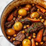 Return the seared beef to the pot and nestle the carrots, potatoes, and chickpeas around it. Bring everything up to a gentle simmer, then cover and reduce heat to low. Let it braise for about 8 hours on low heat or about 3-4 hours on a slightly higher simmer, until the meat is fork-tender and the veggies are cooked through. If you’re using a slow cooker, transferring everything now is the perfect move for hands-off cooking.