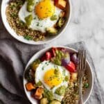This Harvest Roasted Vegetable Grain Bowl is a wholesome and hearty fall-inspired dish featuring oven-roasted sweet potatoes, brussels sprouts, red onion, and red pepper. The veggies are paired with nutty farro tossed in a fresh basil vinaigrette and topped with a perfectly cooked egg. Packed with vibrant flavors and nutrients, this recipe is perfect for a healthy and satisfying vegetarian meal.