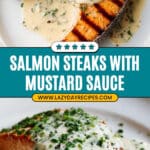 - Serve: Once the salmon is cooked through with a nice char and moist interior, plate the steaks and generously drizzle the creamy mustard chive sauce over the top before serving.