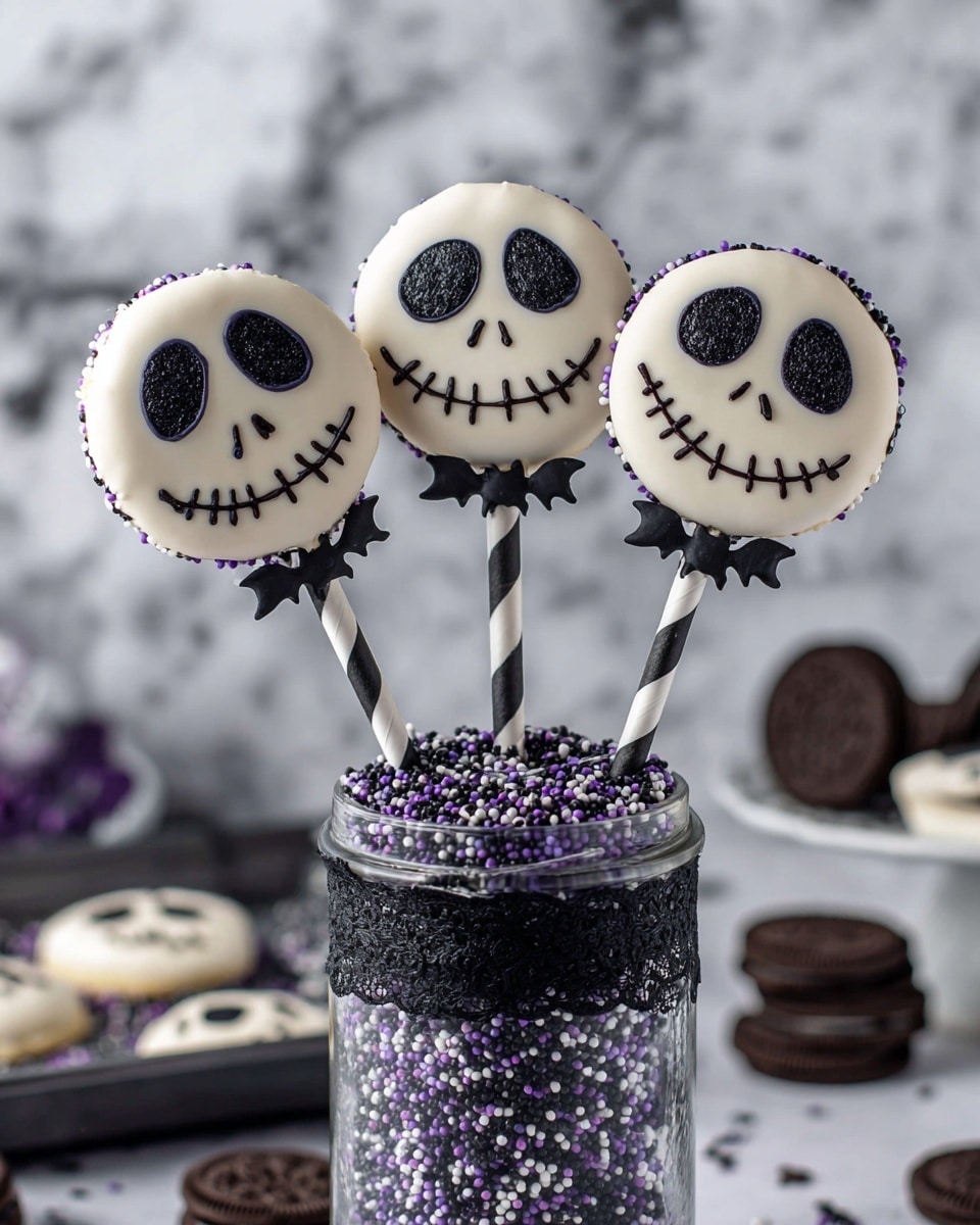Create spooky and adorable Jack Skellington Oreo Pops perfect for Halloween parties or festive occasions. These coated Oreo treats are dipped in white candy melts, decorated with black royal icing, and finished with chocolate bat accents, combining fun and deliciousness in every bite.