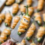 I’ve found freezing jalapeno popper mummies works best if you wrap them before baking. Place the wrapped jalapenos on a tray to freeze individually, then transfer to a freezer bag. When you’re ready, bake them straight from frozen, adding a few extra minutes to the cook time. This is a lifesaver for busy party prep!