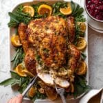 Start roasting the turkey upside down (breast side down) at 230°C/450°F for 30 minutes. This is my favorite trick because it steams the dark meat and helps the breast stay juicy. Plus, the skin crisps on the back, which doesn’t get a lot of attention if you only roast it breast side up.