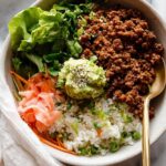 Korean Beef Bulgogi Rice Bowls made easy with flavorful ground beef cooked in a sweet and savory bulgogi sauce, served over steamed rice with wilted spinach, fresh vegetables, mashed avocado, and pickled ginger. A quick and satisfying meal bursting with authentic Korean flavors.