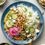 - Assemble the Bowls: Spoon a generous scoop of the spicy feta sauce onto one side of a shallow bowl. Next, add about a ½ cup of cooked rice on the opposite side. Top part of the feta sauce with ¼ cup of roasted chickpeas, and add a scoop of the spiced ground chicken onto the rice in the middle. Arrange sliced cucumbers and pickled red onion on top.