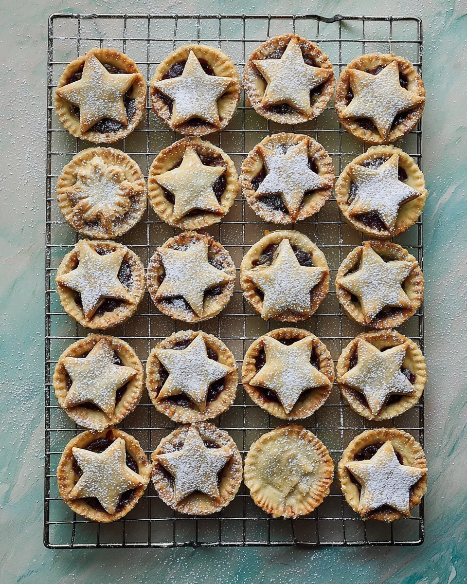 Gather the leftover pastry, roll it out again, and use a star-shaped cutter to cut out 24 stars. Place a star carefully on top of each mince pie, pressing down lightly so they stick—this step is fun, although a bit of a challenge if you’re baking with little ones (mine love the messy part!).
