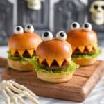 For Halloween or kids’ parties, I like to set each burger on a small plate and add a little “monster footprint” using ketchup or mustard dots beside them. You can also serve the monster eyes on toothpicks separately for guests to add as a fun “build-your-own” option!