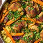This Moroccan-Inspired Chicken Couscous recipe offers a flavorful blend of spices and tender chicken thighs roasted to perfection with carrots, celery, and red onion. The dish is complemented by toasted, cinnamon-infused couscous mixed with fresh parsley for a vibrant and aromatic meal inspired by North African cuisine.