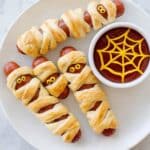 These Mummy Dogs are a fun and spooky Halloween appetizer perfect for kids and adults alike. Wrapped in buttery crescent roll dough to resemble mummies, these hot dogs are easy to make, baked until golden brown, and sure to be a festive crowd-pleaser.