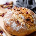 This Thanksgiving Cranberry Walnut Bread is a flavorful no-knead bread perfect for the holiday season. Infused with dried cranberries, chopped walnuts, and bright orange zest, this artisan-style loaf has a crisp crust and a tender, moist crumb. Made using a simple yeast fermentation and baked in a Dutch oven to lock in steam, it delivers bakery-quality bread with minimal hands-on effort. The bread is perfect sliced for breakfast, sandwiches, or alongside your Thanksgiving feast.