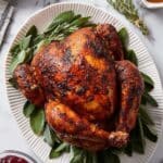 It’s best to fully thaw your frozen turkey before starting this recipe—usually in the fridge for a few days—so the dry brine can properly penetrate and the turkey cooks evenly. Attempting to roast a frozen bird with this technique will result in uneven seasoning and longer, unpredictable cooking times.