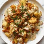 A flavorful and wholesome roasted cauliflower, chickpea, and potato bowl tossed with aromatic spices and served with a creamy tahini dressing. This easy, vibrant sheet pan recipe makes for a perfect vegetarian meal packed with protein and fiber.