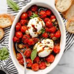 Since this recipe relies on fresh burrata and basil, I don’t recommend freezing fully assembled portions. However, you can freeze the roasted tomatoes without the cheese for up to 2 months and thaw gently before serving.