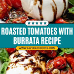 This Roasted Tomatoes with Burrata & Balsamic recipe is a flavorful summer appetizer featuring sweet grape tomatoes roasted to perfection with garlic and oregano, topped with creamy burrata cheese, and finished with a tangy homemade balsamic reduction. Served with fresh basil and crusty sliced French baguette, it makes an elegant yet easy dish perfect for entertaining or a light snack.