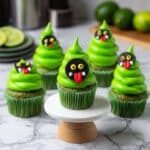 6. Serve and Enjoy: Allow the cupcakes to set slightly so the frosting firms up. Serve at room temperature. These cupcakes make a perfect festive treat with their tangy lime flavor balanced by rich buttery frosting and eye-catching Slimer decorations.