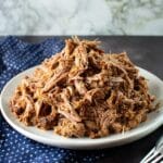 A large white plate is filled with a mound of shredded cooked meat piled high at the center. The meat has a mix of light and dark brown shades, showing the texture of tender strands and small chunks. The plate sits on a dark surface with a white marbled background behind. A folded blue cloth napkin is partially visible next to the plate. photo taken with an iphone --ar 4:5 --v 7