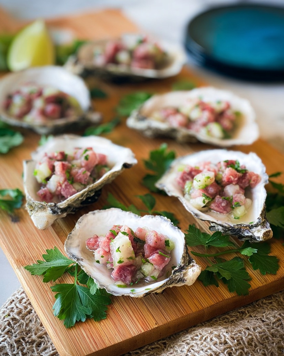 For parties, I’ve arranged the oysters on a bed of sea salt or crushed ice for a dramatic effect—this keeps them chilled and looks stunning. Sometimes I put out small individual tasting spoons filled with the topping for those who prefer not to eat raw oysters directly. It’s a crowd-pleaser and adds a bit of playful elegance!