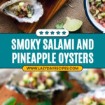 Lay your fresh oysters out on a pretty serving platter, nestled in their shells. Spoon a generous dollop of the salami and pineapple topping on each oyster right before serving—this keeps the oysters fresh and the toppings bright. I always serve extra lime wedges on the side because a little squeeze of fresh lime juice on top just makes the flavors pop!