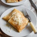 Two square folded crepes with a light golden-brown color are placed side by side on a white plate. The crepe in front is partially opened with a fork lifting a piece, showing green spinach leaves mixed with creamy white sauce inside. Both crepes have white shredded cheese sprinkled on top. To the right of the crepes, there is a small pile of chunky red tomato salsa with visible pieces of onion. The plate sits on a white marbled surface. photo taken with an iphone --ar 4:5 --v 7