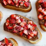 - Assemble the Bruschetta: Spread the Nutella and cream cheese mixture evenly over each toasted bread slice. Top generously with diced strawberries.