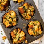Delicious and easy-to-make Stuffing Muffins featuring whole wheat French bread, savory pancetta, fresh herbs, and a flavorful blend of vegetables. Perfectly portioned in a muffin tin for convenient serving and enhanced with a golden baked crust.