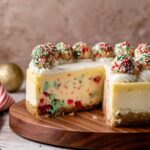 Indulge in the festive flavors of this Sugar Cookie Cheesecake featuring a buttery sugar cookie crust, creamy cheesecake flecked with colorful cookie dough balls, and a luscious white chocolate ganache topping. Perfect for holiday celebrations or any special occasion, this dessert combines the best of soft sugar cookies and rich cheesecake in one delightful treat.